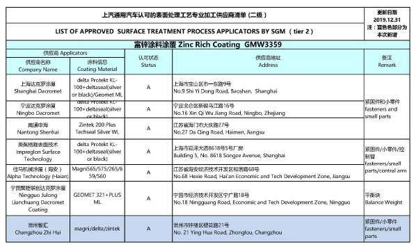 2019年,公司分別與德國DORKEN MKS公司、美國Magni集團及德國Atotech公司合作,共同致力于推廣和開發(fā)國內外的環(huán)保鋅鋁涂層防腐系統(tǒng)。公司于2020年,體系管理得到了上海通用、上海大眾汽車等主機廠的評審認可。智匯涂覆,以新起點、新高度,來不斷完善您的防腐系統(tǒng)工程,用我們的解決方案,成就您公司的未來。